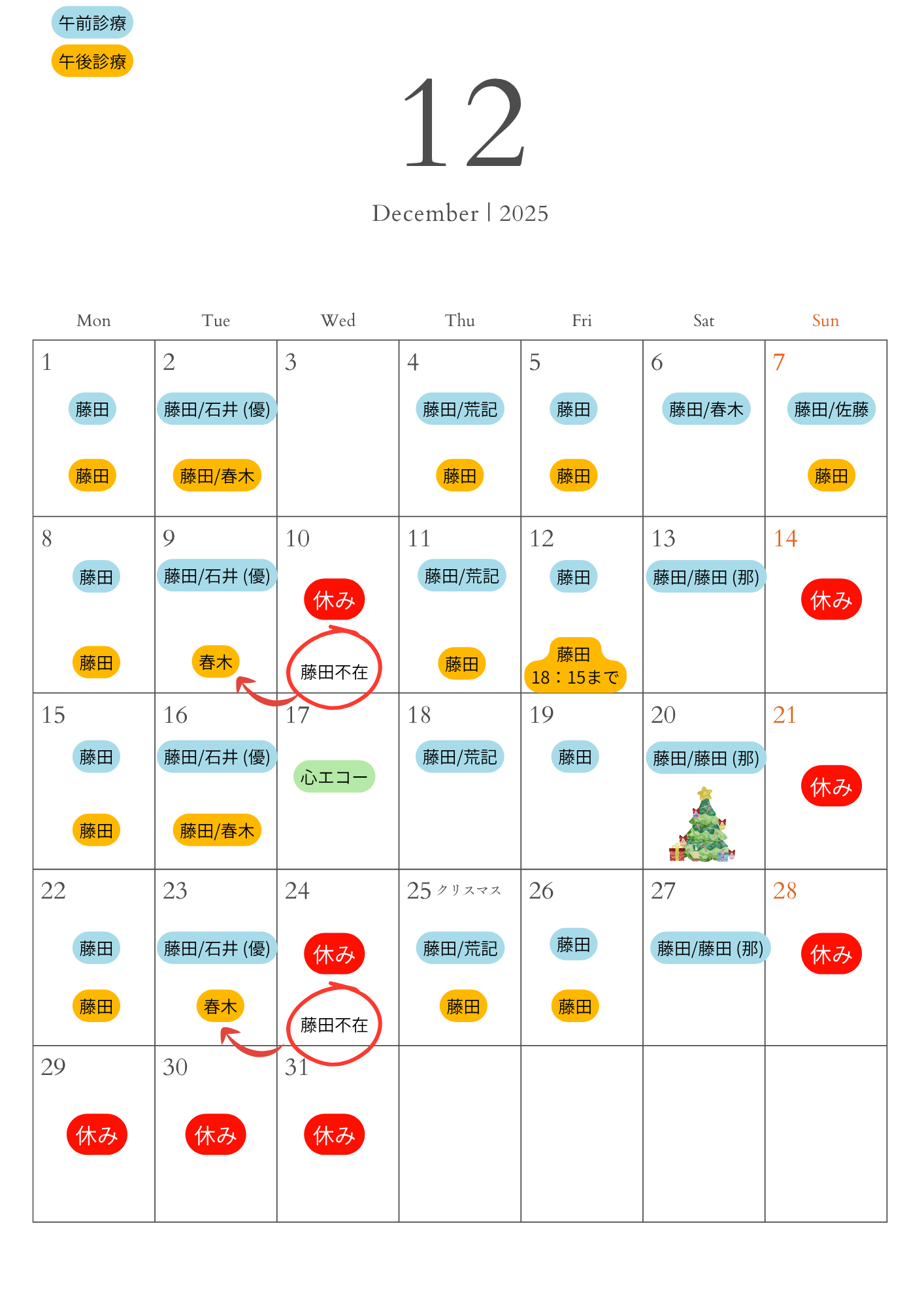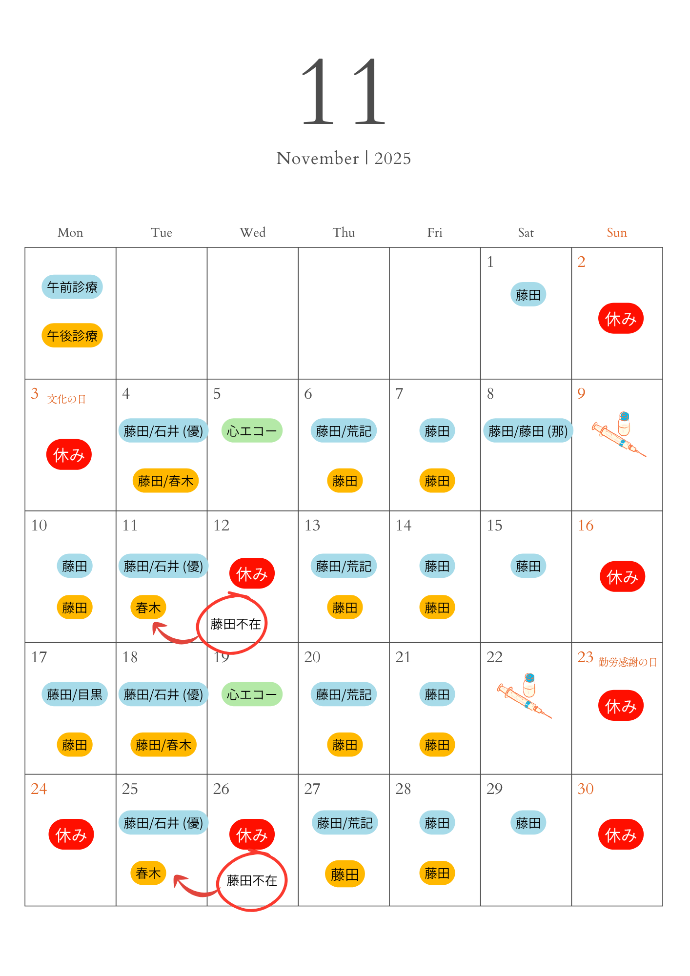 診療スケジュール 2025.10.11 新着情報 11月9日:インフルエンザワクチン特別接種日 11月11日:PM藤田医師不在 11月22日:インフルエンザワクチン特別接種日 11月25日:PM藤田医師不在 12月7日:休日診療 (町田市当番) 12月9日:PM藤田医師不在 12月12日:PM診療は18:15分まで 12月20日:クリスマスイベント 12月23日:PM藤田医師不在
