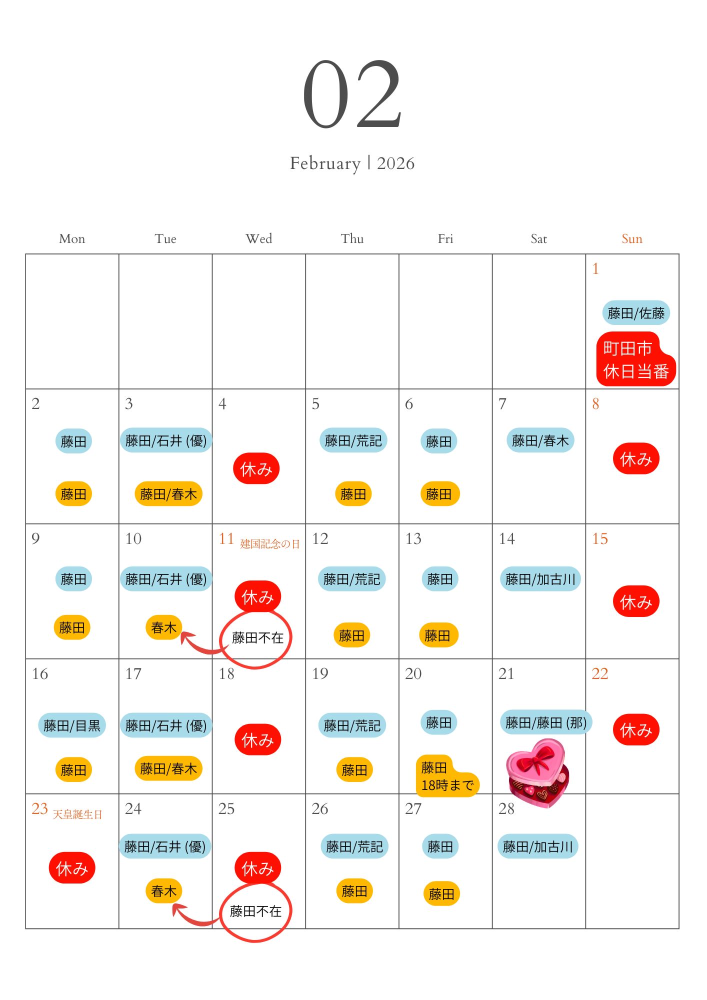 診療スケジュール 2025.10.11 新着情報 2026年 2月1日:日曜日診療・町田市休日当番 2月10日:PM藤田医師不在 2月20日:PM 18:00まで (最終受付17:30) 2月21日:バレンタインイベント 2月24日:PM藤田医師不在